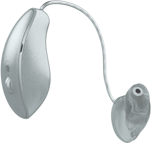 RIC hearing aids are BTE variants with an open-fit design for most hearing loss types. Their speaker sits in the ear tip, not the main body. Like BTEs, they’re small, light, and feature advanced tech for mild to severe hearing loss.
